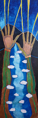 She loves living near water, surrounded by trees and hills. So when Emily Sabino traced her arms for this particular painting, she was thinking about how veins and arteries are the human version of rivers and waterways. Her work has been exhibited at Waterfall Arts in Belfast; River Arts in Damariscotta, Maine Art Gallery in Wiscasset, and Kerr Jones Gallery in East Boothbay.